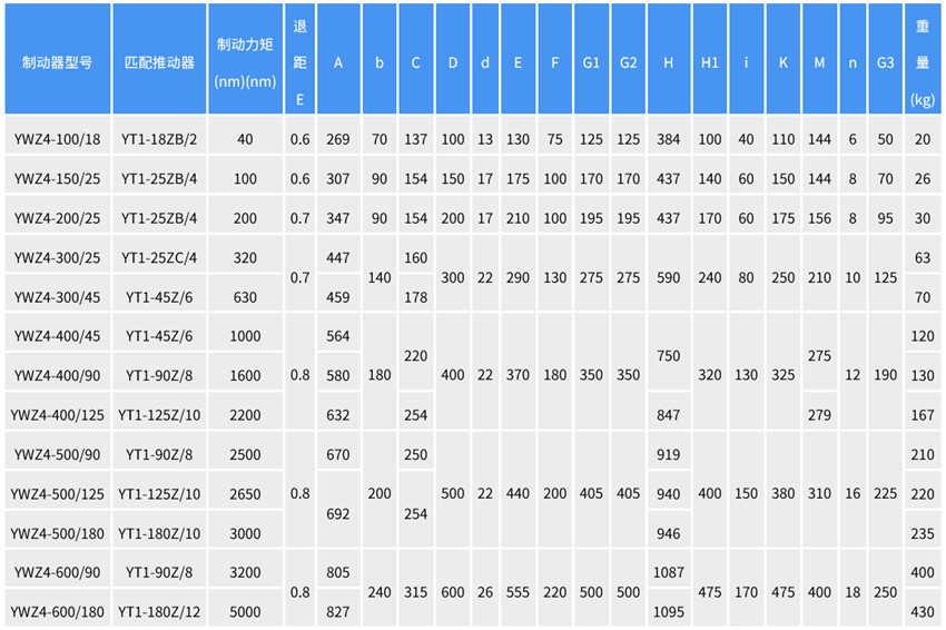 注:YWZ4系列的制動(dòng)器匹配YT1推動(dòng)器,替代原YWZB;