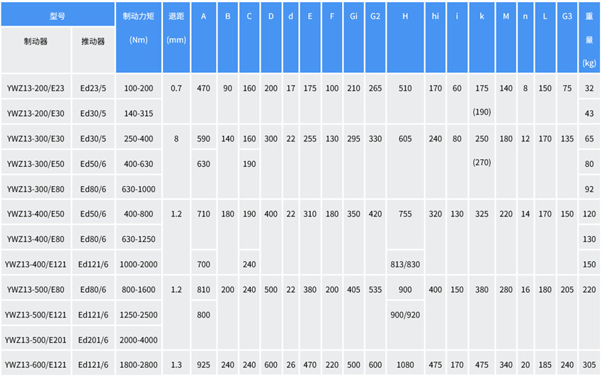 YWZ13系列電力液壓鼓式制動器的安裝尺寸和制動力矩參數(shù)符合JB/ZQ4388-1997標(biāo)準(zhǔn),其技術(shù)要求符合JB/T6406-2006標(biāo)準(zhǔn)。