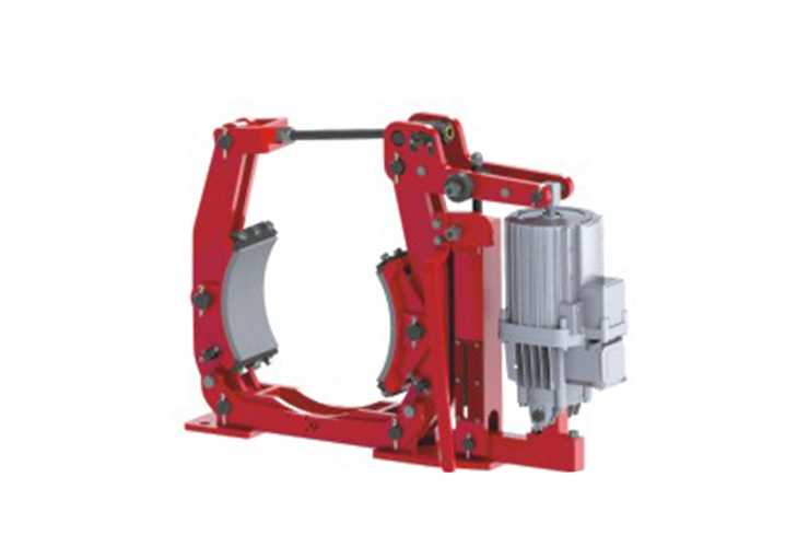 當(dāng)通電時,電力液壓推動器發(fā)生動作,其推桿快速上升,通過杠桿動作打開(釋放)剎車片;當(dāng)斷電時,電力液壓推桿在制動彈簧力的作用下迅速下降,通過杠桿作用使剎車片閉合。